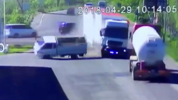 Момент столкновения фуры и бензовоза на дороге Бишкек–Ош попал на камеру видеонаблюдения